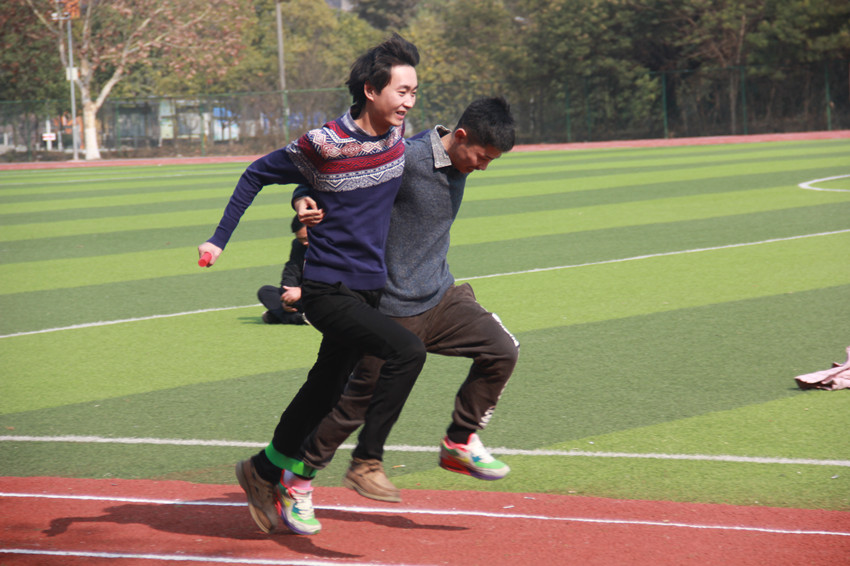 不久由于求胜心切,各个赛道上就呈现出一派热闹欢腾的景象:有的腿开始“打架”,有的拉扯得跑不了了干脆停下来慢慢走,有的索性直接改跑为跳,还有的跑着跑着摔翻在地,洋态可憨掬···两旁的啦啦队连“加油”都顾不上喊了,笑得前仰后合,泪花都快出来了。 虽然是一片喜庆、洋态百出,但是各支队伍还是慢慢找出了默契,无论是摔倒还是用别出心裁的方式“跑”,大家始终怀着强烈的集体荣誉感,相互鼓励着、搀扶着跑完全程!
